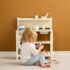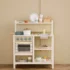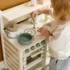 This play kitchen is designed for little chefs to explore cooking and baking in their own way. It features an oven with an opening door, a removable baking tray that fits inside and a set of pots and pans, including a lid that works with both the frying pan and the saucepan. Three wooden kitchen tools, a spoon, a slotted spoon and a spatula, are included and can be stored neatly in special slots on the counter. A small shelf at the back provides space for placing small items, while an open shelf below offers additional storage for pots, pans or food. The striped pattern on the front of the oven and the side of the kitchen adds a simple, playful detail. This product is made from FSC-certified wood. Perfect for inspiring imaginative play and creating fun cooking scenarios.