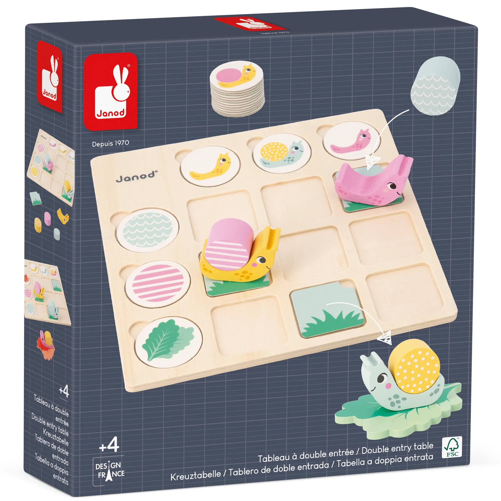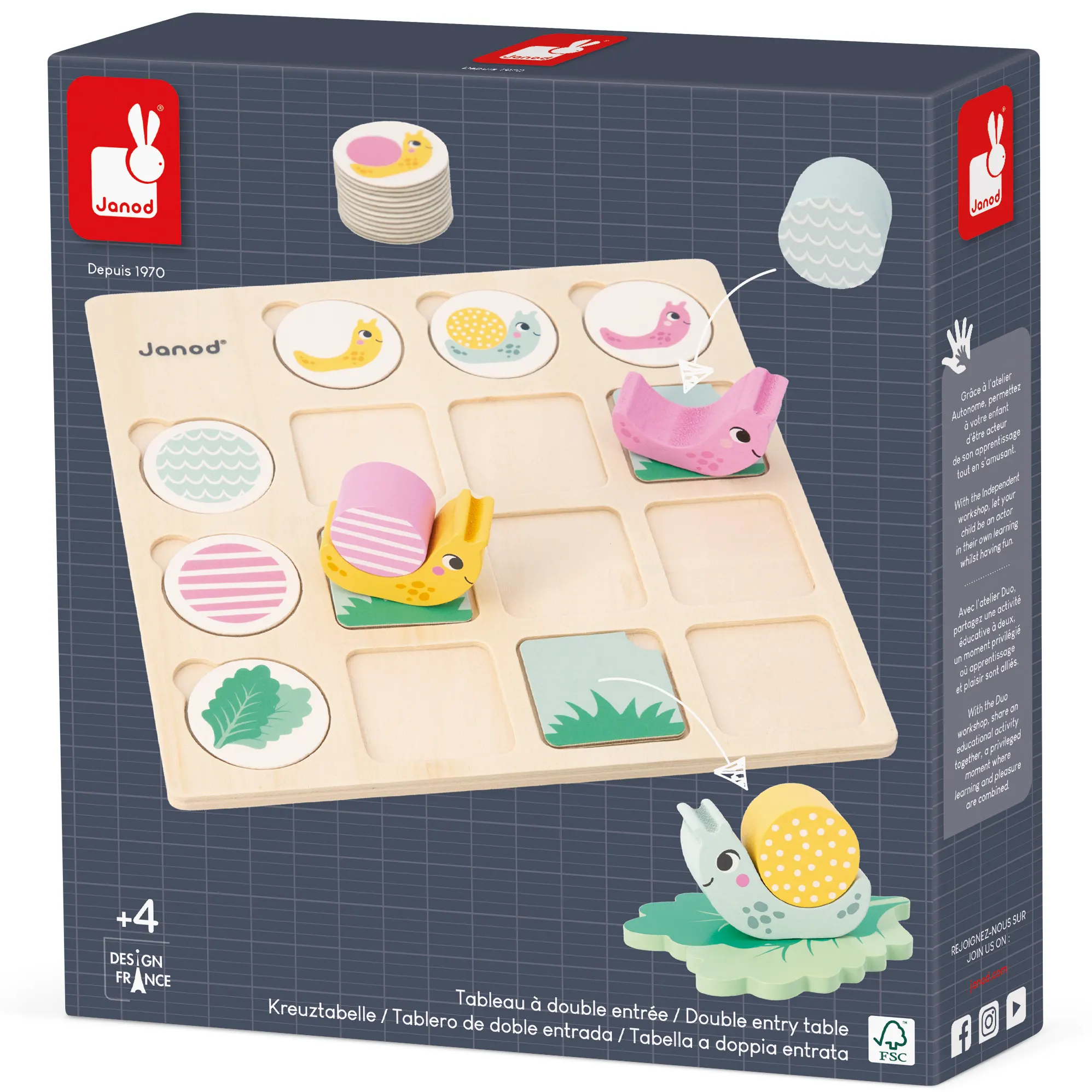 Βοηθήστε τα σαλιγκάρια να βρουν το καβούκι τους και το αγαπημένο τους φύλλο μαρουλιού! Αυτό το εκπαιδευτικό παιχνίδι θα επιτρέψει στο παιδί σας να αναπτύξει τη λογική του και να μάθει πώς να κινείται στον χώρο. Αυτός ο πίνακας διπλής εισόδου είναι απόλυτα κατάλληλος για μικρά παιδιά. Τα τρισδιάστατα εξαρτήματα θα διευκολύνουν το παιδί σας να συνδέσει τα χαρακτηριστικά που τέμνονται στις γραμμές και τις στήλες. Το παιχνίδι περιλαμβάνει ξύλινο ταμπλό, 3 σώματα σαλιγκαριού, 12 καβούκια, 3 ξύλινα φύλλα μαρουλιού, 3 κάρτες από χαρτόνι και βαμβακερή τσάντα αποθήκευσης. Ο πίνακας διπλής εισόδου είναι ένα ιδανικό παιχνίδι για να συνδυάσετε την εκμάθηση με τη διασκέδαση του παιδιού σας. Παιχνίδι κατασκευασμένο από ξύλο και κόντρα πλακέ πιστοποιημένα από το Συμβούλιο Διαχείρισης των Δασών (FSCTM). Εκπαιδευτικό παιχνίδι που αναπτύχθηκε σε συνεργασία με εκπαιδευτικό, ιδανικό για παιδιά ηλικίας από 4 ετών.