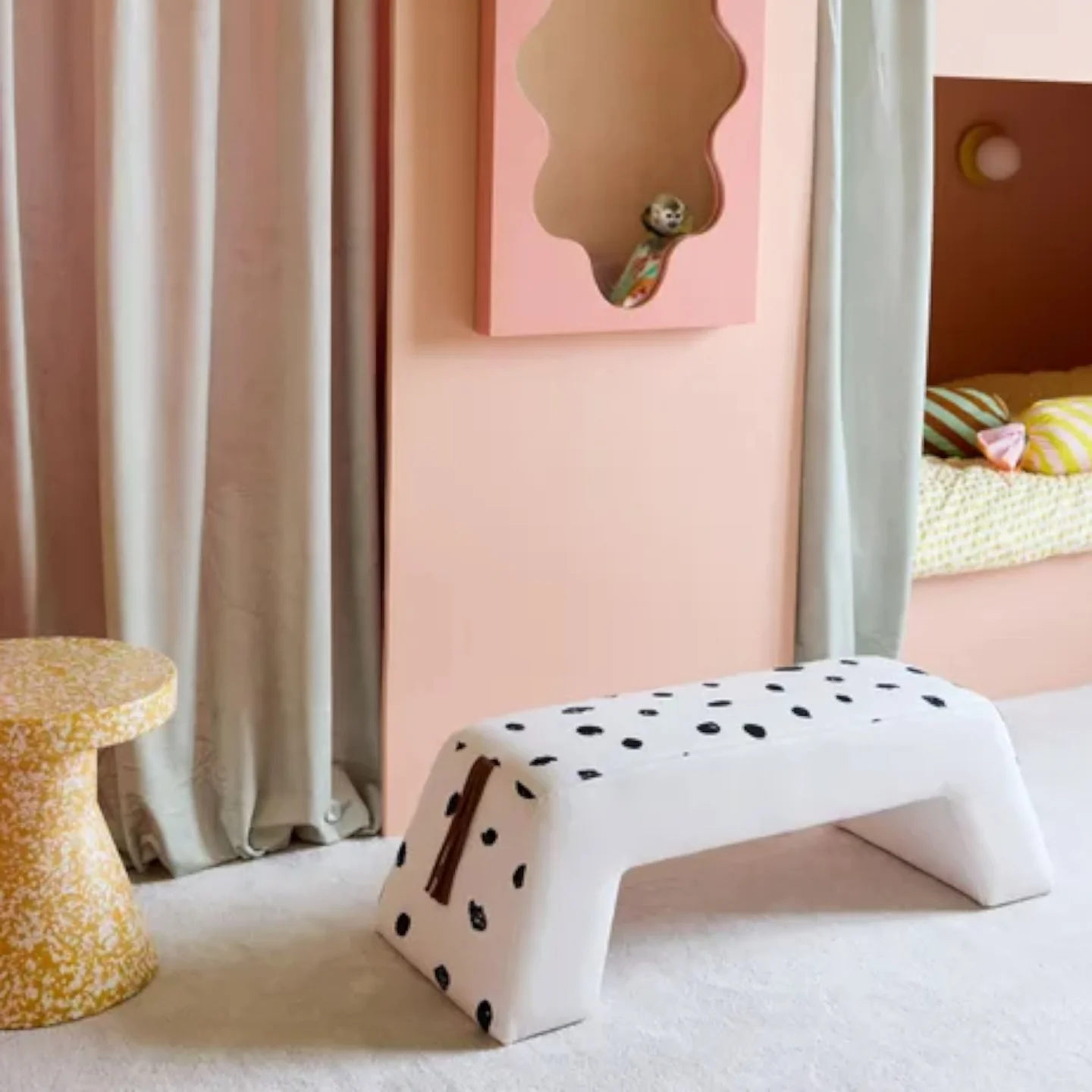 «Αυτό θα πει ζωή!» είπε η Πίπη, τεντώνοντας τα πόδια της όσο πιο μακριά μπορούσε. Στις ιστορίες της, η Πίπη συχνά ανεβαίνει στο άλογό της χωρίς σέλα, γεμάτη αυτοπεποίθηση και ελευθερία, πάντα αυθεντική, πάντα η Πίπη. Αυτό το μαλακό, επενδυμένο παγκάκι εμπνέεται από το αγαπημένο της άλογο. Ντυμένο με ύφασμα με πουά μοτίβο, θυμίζει το χαρακτηριστικό τρίχωμά του. Και στις δύο πλευρές έχει στρογγυλεμένες άκρες για άνεση, ενώ στη μία πλευρά η διακοσμητική φούντα παραπέμπει στην κίνηση της ουράς. Πρακτικό και ευέλικτο, μπορεί να χρησιμοποιηθεί ως κάθισμα στο χολ, ως σημείο για τσάντες ή βιβλία, ή ως μια ζεστή γωνιά δίπλα στο παράθυρο. Για τα παιδιά όμως είναι μια ευκαιρία να σκαρφαλώσουν και να φανταστούν ότι κάνουν τη δική τους βόλτα με το άλογο της Πίπης!