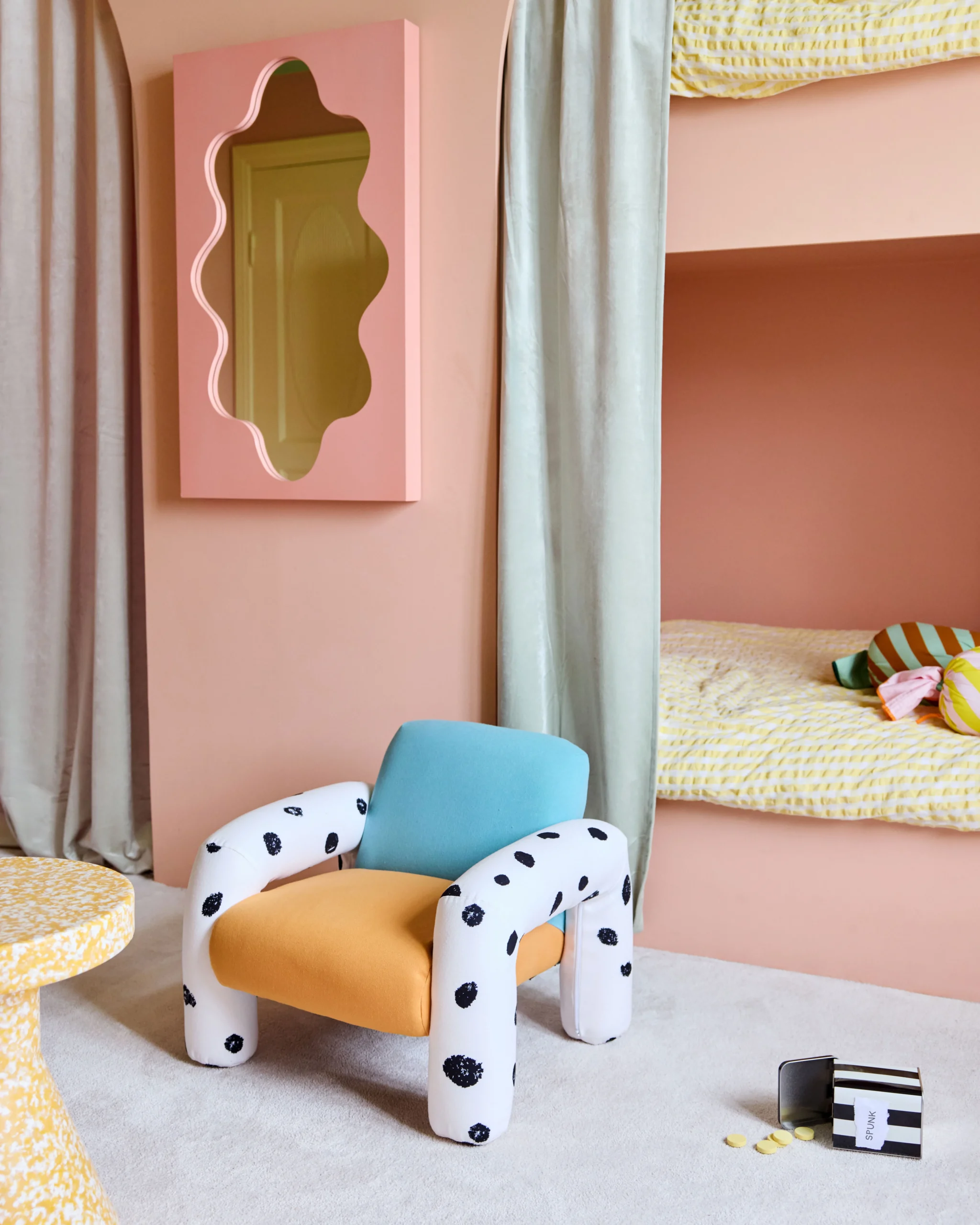 «Πώς να ξέρω, αφού ποτέ δεν δοκίμασα;» λέει η Πίπη, θυμίζοντάς μας ότι κάθε καινούρια εμπειρία ξεκινά με περιέργεια και θάρρος! Αυτή η πολυθρόνα φέρνει στο σπίτι λίγη από την ατρόμητη και παιχνιδιάρικη διάθεση της Πίπης. Επενδυμένη με μαλακό ύφασμα πολυεστέρα και διακοσμημένη με πουά σχέδιο εμπνευσμένο από το αγαπημένο της άλογο, συνδυάζει άνεση και χαρακτήρα. Το κάθισμα και η πλάτη χωρίζονται σε δύο έντονα χρώματα, τιρκουάζ και πορτοκαλί, που της δίνουν μοναδική εμφάνιση και ξεχωριστή παρουσία σε κάθε χώρο. Πρακτική και ταυτόχρονα εντυπωσιακή, είναι ιδανική για όσους αγαπούν τα έπιπλα με προσωπικότητα. Όπως και η Πίπη, η πολυθρόνα αυτή μας υπενθυμίζει ότι το να δοκιμάζουμε νέα πράγματα κάνει τη ζωή πιο χαρούμενη και το σπίτι πιο ζωντανό.