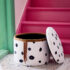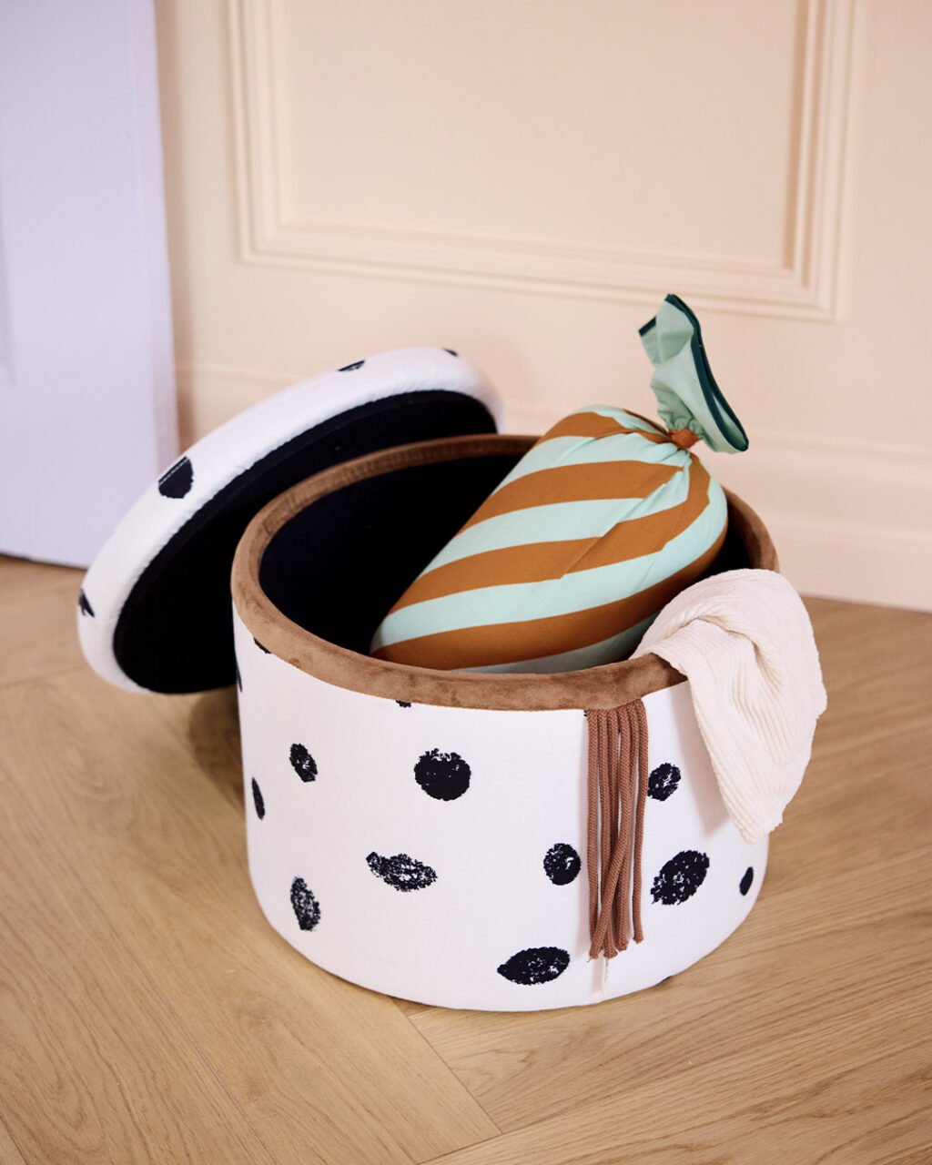 «Η ζωή είναι καλύτερη όταν είναι οργανωμένη – ειδικά όταν την οργανώνεις μόνος σου!» λέει η Πίπη η Φακιδομύτη, και αυτό το σκαμπό κουβαλάει το ίδιο παιχνιδιάρικο πνεύμα! Με υφασμάτινη επένδυση σε πουά μοτίβο εμπνευσμένο από το αγαπημένο άλογο της Πίπης και με μακριά φούντα στη μία πλευρά σαν ουρά που κινείται, το έπιπλο αυτό ξεχωρίζει για τον χαρακτήρα του. Στο εσωτερικό του, με μαύρη φόδρα, κρύβει αποθηκευτικό χώρο για μικρούς θησαυρούς ή καθημερινά αντικείμενα. Το μέγεθός του το κάνει ευέλικτο: μπορεί να χρησιμοποιηθεί ως σκαμπό, κομοδίνο ή απλώς σαν κάθισμα για να φορέσετε τις κάλτσες σας. Πρακτικό, παιχνιδιάρικο και με προσωπικότητα, αυτό το σκαμπό φέρνει τη φαντασία της Πίπης στο σπίτι σας!