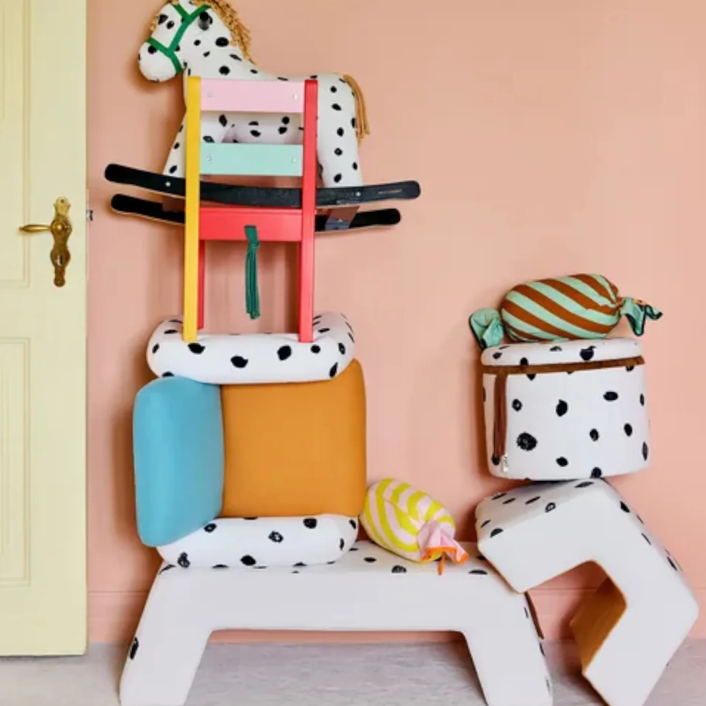 «Όλα είναι λίγο ανακατεμένα, κι αυτό είναι υπέροχο!» όπως θα έλεγε και η Πίπη. Το ίδιο παιχνιδιάρικο πνεύμα αποτυπώνεται σε αυτό το ξεχωριστό σκαμπό. Με σχέδιο εμπνευσμένο από τον Λίλα Γκούμπεν, το αγαπημένο άλογο της Πίπης, και με απαλές στρογγυλεμένες άκρες, έχει φιλόξενη όψη και πρακτικότητα μαζί. Ταιριάζει ιδανικά ως έξτρα κάθισμα, υποπόδιο ή διακοσμητική πινελιά που ζωντανεύει κάθε χώρο. Το σκαμπό είναι μαλακά επενδυμένο μέσα κι έξω, χαρίζοντας άνεση και στιλ. Από κάτω, μια έκπληξη: η έντονη πορτοκαλί απόχρωση δίνει χρώμα και χαρούμενη ενέργεια. Ένα πολυχρηστικό έπιπλο που φέρνει στο σπίτι σας λίγη από τη ζωηρή διάθεση της Πίπης!