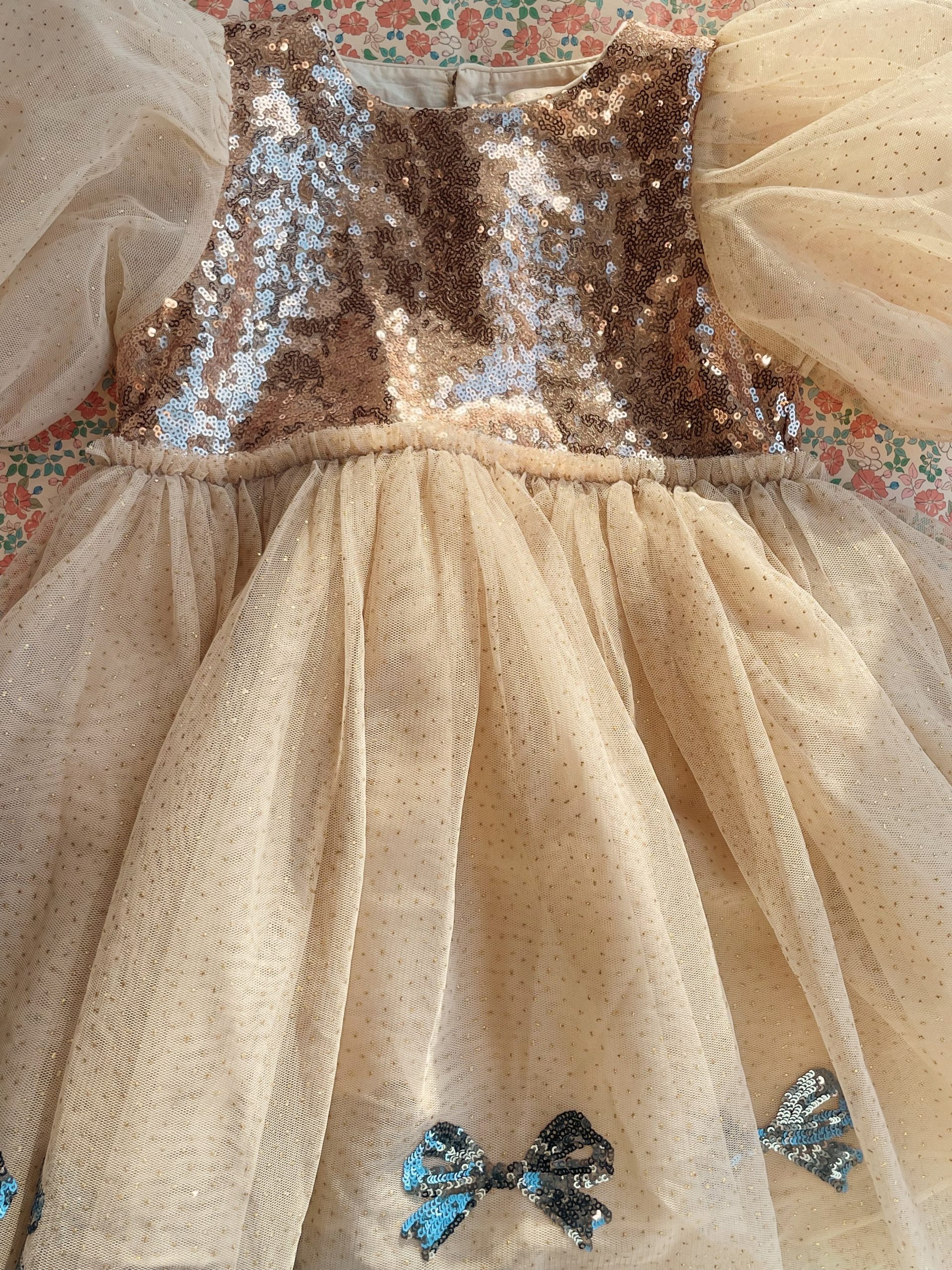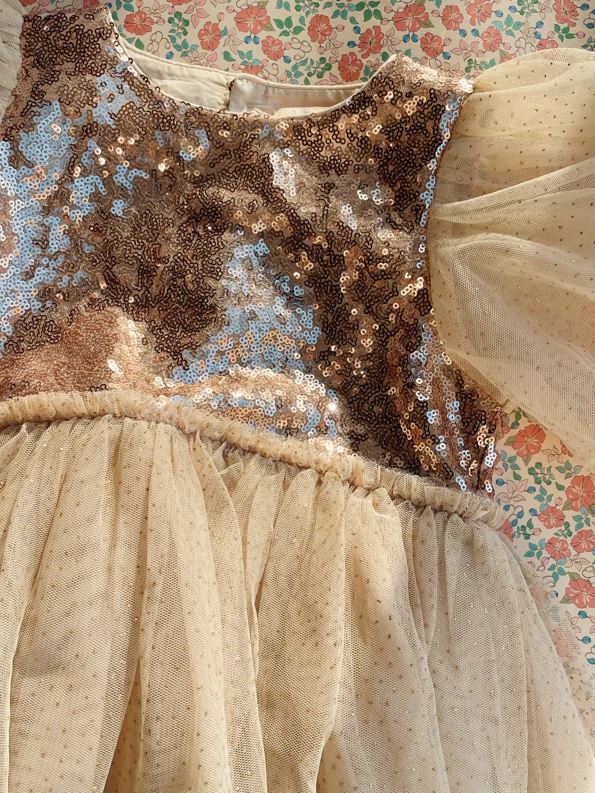 - Κομψό φόρεμα με όγκο και λάμψη. Σχεδιασμένο με στρώσεις από τούλι και απαλή βαμβακερή επένδυση.