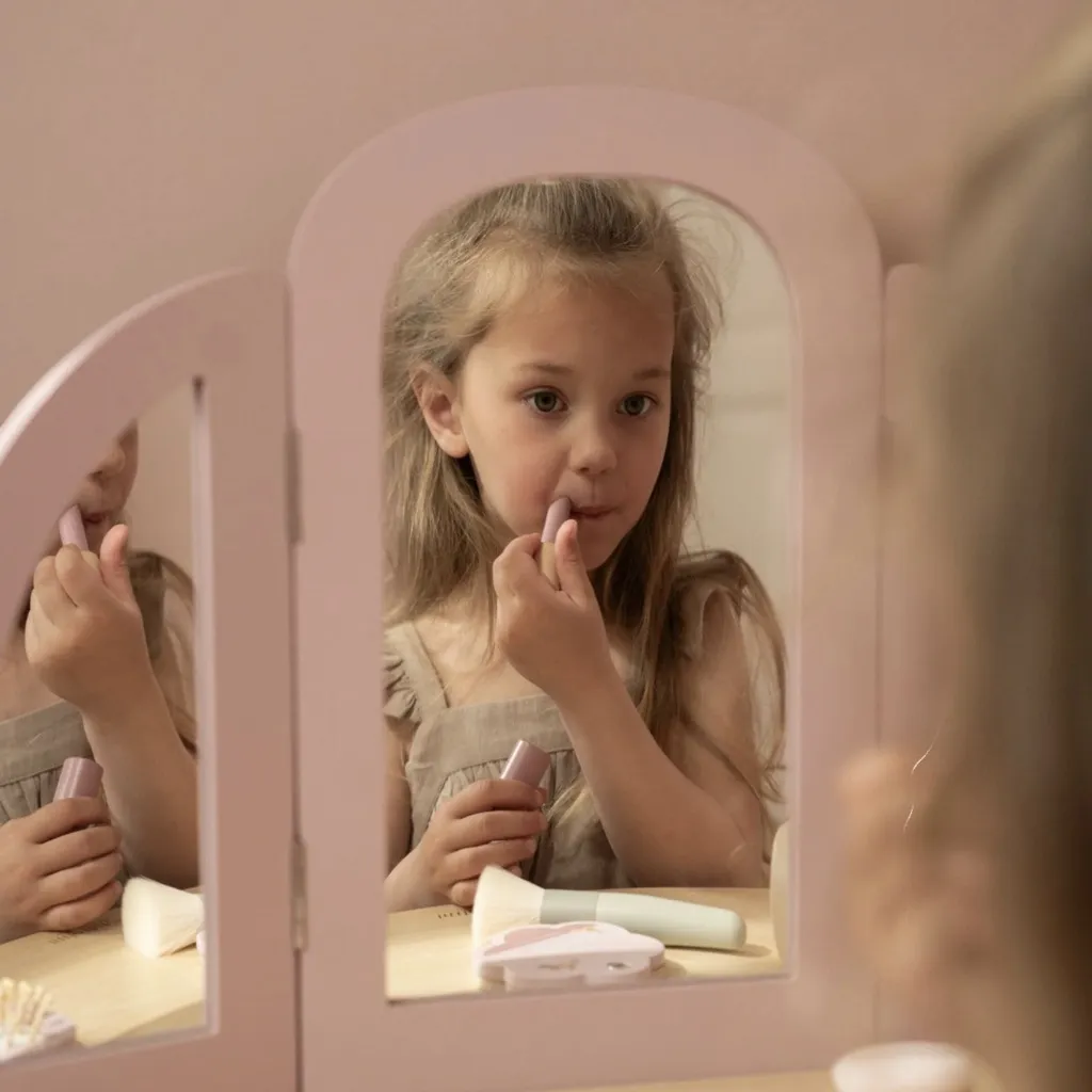 Νιώστε σαν μια πραγματική πριγκίπισσα με το υπέροχο Little Dutch Boudoir Μεγάλο σε ροζ χρώμα! Το κομψό ξύλινο boudoir διαθέτει έναν καθρέφτη τριών πάνελ, ώστε το παιδί να μπορεί να θαυμάζει τον εαυτό του από κάθε γωνία, ενώ τα ευρύχωρα συρτάρια προσφέρουν χώρο για όλα τα αγαπημένα αξεσουάρ ομορφιάς. Το σετ περιλαμβάνει 6 ξύλινα προϊόντα ομορφιάς και ένα χαριτωμένο σκαμπό με λουλουδάτη εικονογράφηση, ιδανικό για παιχνίδι ρόλων και μίμηση των μεγάλων. Κατασκευασμένο από ξύλο με πιστοποίηση FSC και βαμμένο με φιλική προς τα παιδιά βαφή με βάση το νερό, προσφέρει ασφάλεια και ποιότητα.