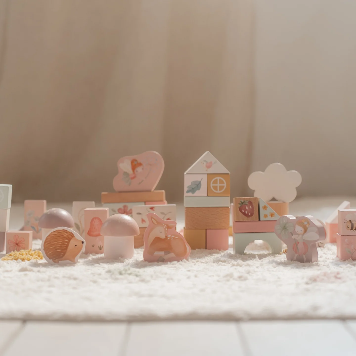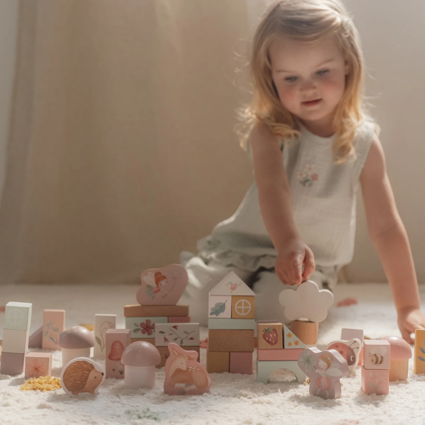Περιέχει τουλάχιστον 50 ξύλινα τουβλάκια σε διάφορα σχήματα και μεγέθη. Στοιβάξτε τα τουβλάκια για να δημιουργήσετε διασκεδαστικά σχήματα ή πύργους. Τα τουβλάκια εγγυώνται πολλές ώρες δημιουργίας και φαντασίας, ενώ μπορούν να αποθηκευτούν εύκολα!