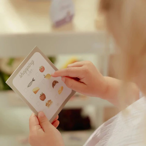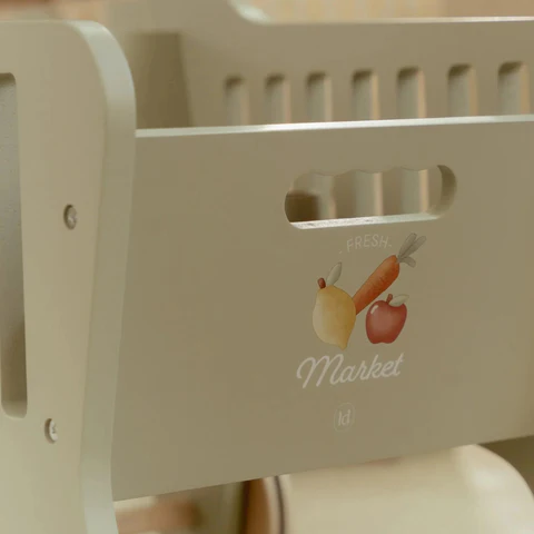 Κάντε τα ψώνια μια πραγματική περιπέτεια! Αυτό το ανθεκτικό ξύλινο καροτσάκι διαθέτει άφθονο χώρο για όλα τα ψώνια σας, ακόμα και για τη μεγαλύτερη λίστα. Το ξύλινο κλιπ κρατάει τη λίστα αγορών σταθερά στη θέση της, ώστε να μη ξεχαστεί τίποτα. Το σετ περιλαμβάνει διάφορα προϊόντα και μια πρακτική τσάντα αγορών, για παιχνίδι από την πρώτη στιγμή. Με μια χαρούμενη εικονογράφηση στο μπροστινό μέρος, το καρότσι κάνει το παιχνίδι ακόμη πιο διασκεδαστικό. Για την απόλυτη εμπειρία αγορών, συνδυάστε το με τον ξύλινο πάγκο αγοράς και απολαύστε ατελείωτη διασκέδαση!