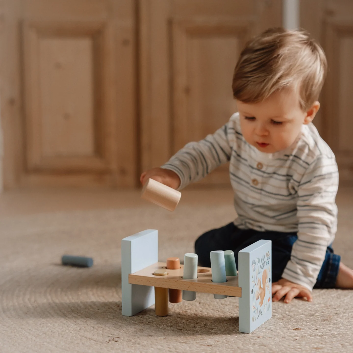 Ξύλινο παιχνίδι αντιστοίχισης με σφυρί. Το παιδί μπορεί να χτυπάει τα ξύλα που προεξέχουν, ένα προς ένα, κάνοντας έτσι μια πολύ καλή άσκηση για τις κινητικές δεξιότητές του. Σφυροκοπήσατε όλα τα ξύλα και δεν έμεινε κανένα; Γυρίστε τον πάγκο ανάποδα για να το ξανακάνετε! Θα διασκεδάζετε για ώρες!