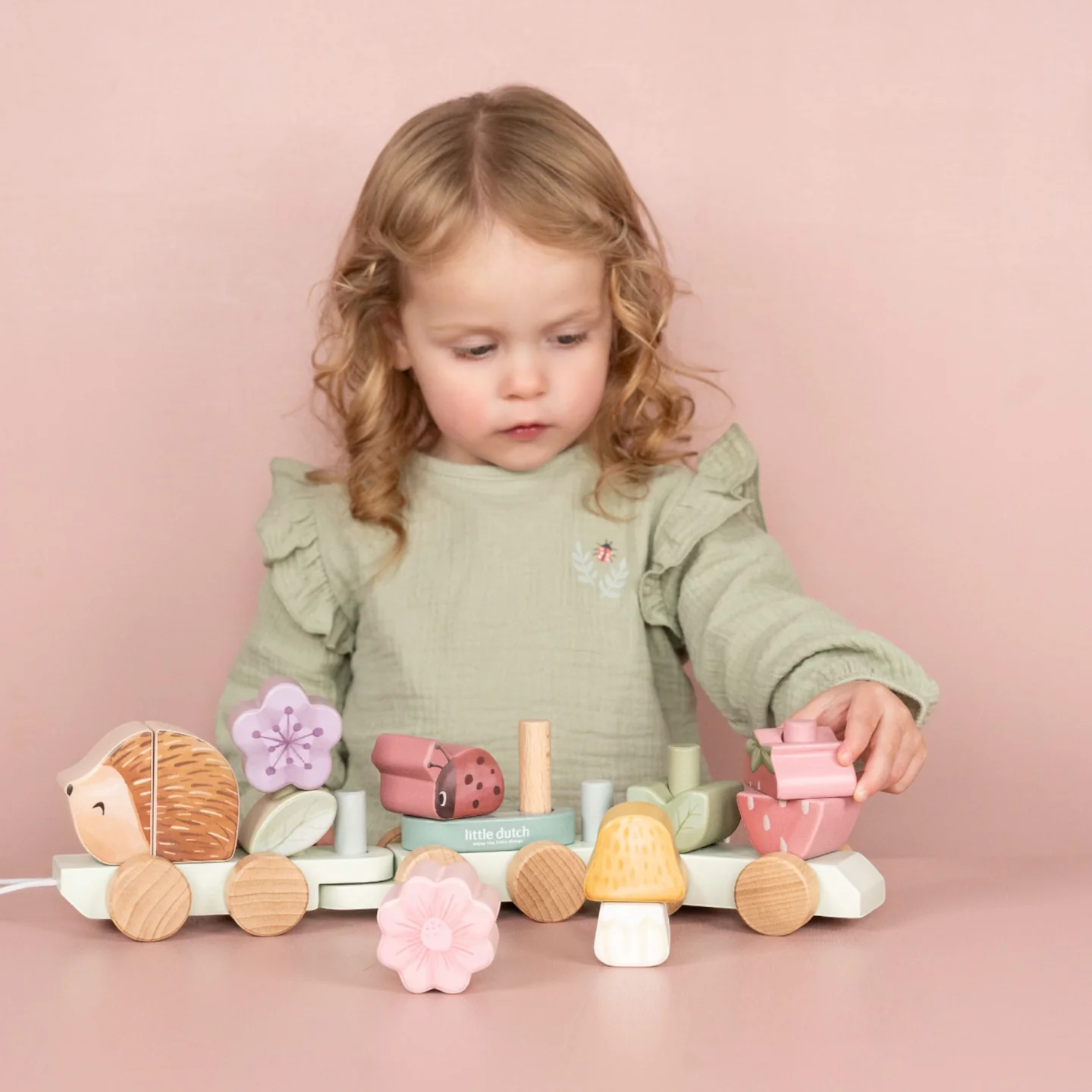 Φτιάξτε το δικό σας μαγικό τρένο, στοιβάζοντας ένα-ένα τα τουβλάκια πάνω στα τρία ξύλινα βαγόνια. Ποιος θα ηγηθεί της διαδρομής; Ο αξιολάτρευτος σκαντζόχοιρος είναι έτοιμος να πάρει το προβάδισμα! Ποιο λουλούδι όμως θα ακολουθήσει και πού θα βρει τη θέση της η πασχαλίτσα;