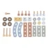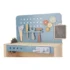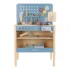 Ο πάγκος εργασίας διαθέτει μια σχάρα αποθήκευσης με 4 γρανάζια, έναν πίνακα κιμωλίας, δύο αποθηκευτικούς κάδους και μια μέγγενη. Έρχεται με ένα σετ 55 εξαρτημάτων που περιλαμβάνει παξιμάδια και μπουλόνια, βίδες, πάνελ, τροχούς και βασικά εργαλεία όπως σφυρί, πριόνι, κατσαβίδι, ισοπεδωτή, χάρακα και κλειδί. Ο στιβαρός ξύλινος πάγκος εργασίας σε μοντέρνα χρώματα δημιουργεί έναν υπέροχο χώρο παιχνιδιού στο παιδικό δωμάτιο, αλλά θα φαίνεται υπέροχος και σε ένα σαλόνι.