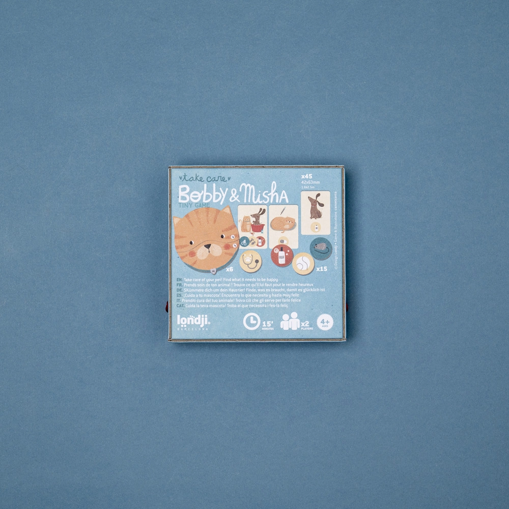 Με τη νέα σειρά «Tiny Games» η Londji φέρνει μικρά παιχνίδια για μεγάλες περιπέτειες! Χωράνε στην τσέπη σας και σας ακολουθούν παντού. Όπου κι αν πάτε, η διασκέδαση είναι πάντα μαζί σας! Ο Μπόμπι και η Μίσα σας περιμένουν για παιχνίδι και φροντίδα! Δύο σκανταλιάρικα ζωάκια χρειάζονται τη βοήθειά σας. Γυρίστε τις κάρτες, βρείτε τις σωστές μάρκες και προσφέρετε στο κατοικίδιό σας ό,τι χρειάζεται. Κάθε σωστή επιλογή είναι μια μικρή πράξη αγάπης που το φέρνει πιο κοντά σε ένα μεγάλο, χαρούμενο χαμόγελο. Ανακαλύψτε τι του λείπει και χαρίστε του ευτυχία!