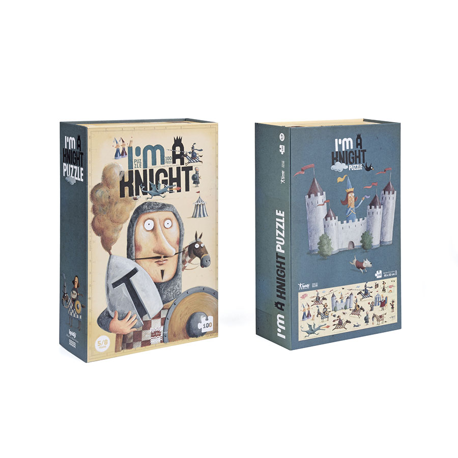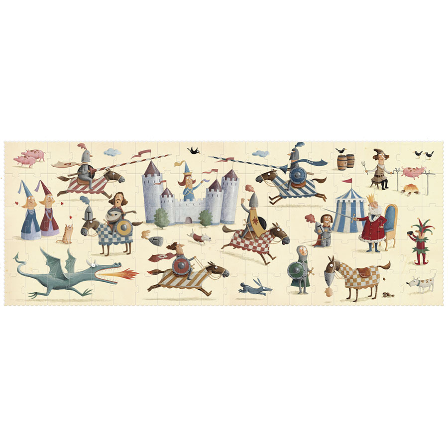 Παζλ 100 κομματιών, από ανακυκλωμένο χαρτί και χαρτόνι, με υπέροχη εικονογράφηση, από την εποχή των ιπποτών, με κάστρα, δράκους, ιππότες με τα άλογά τους κ.ά. Διαστάσεις παζλ 85 x 32 εκ.