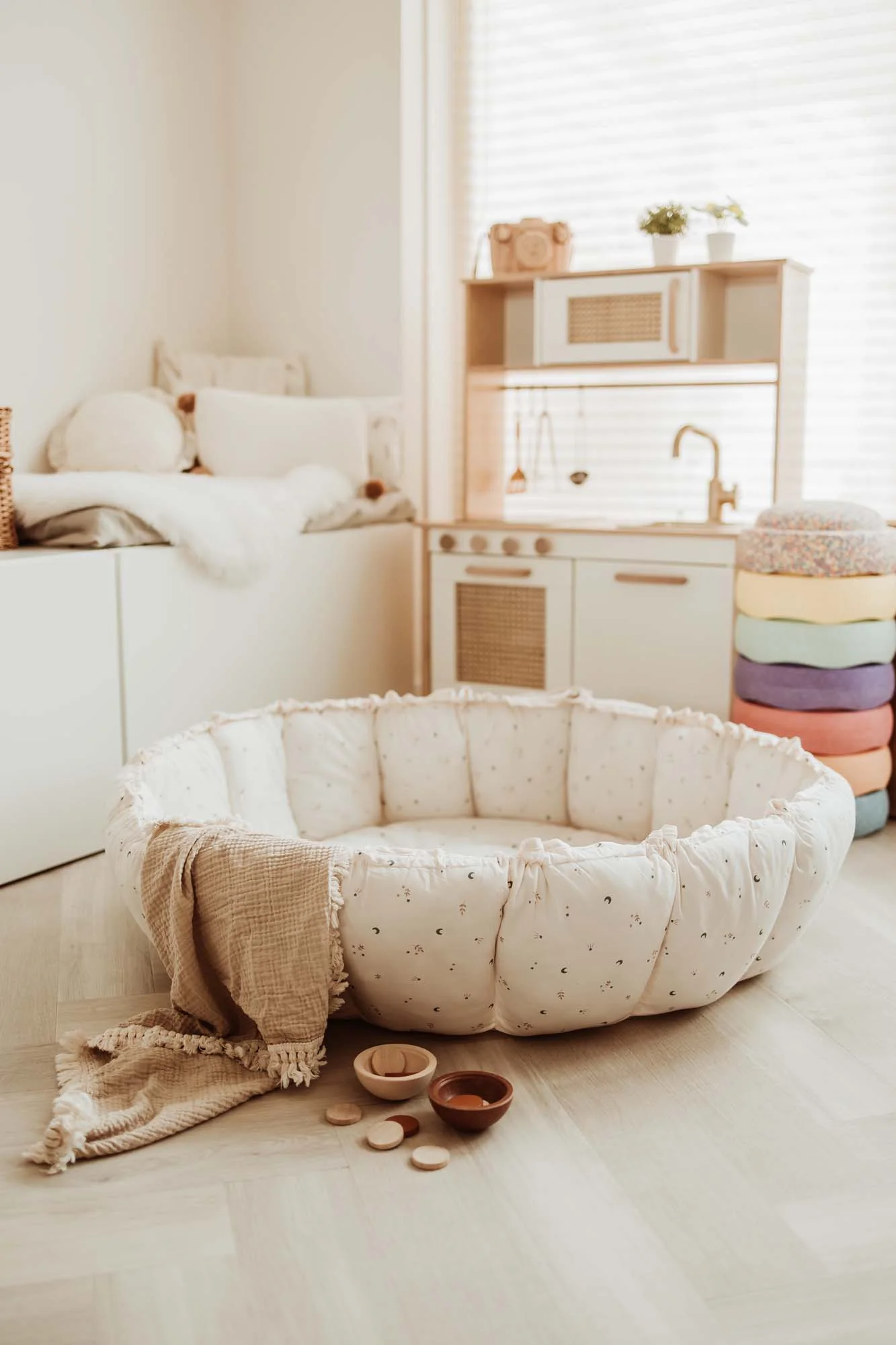 Όταν σηκώνονται, τα πέταλα δημιουργούν ένα ασφαλές κρεβατάκι για το μωρό σας, με μαλακά προστατευτικά για την ασφάλειά του. Όταν είναι ανθισμένο, το στρώμα παιχνιδιού ανοίγει και τα προστατευτικά του χαμηλώνουν, δημιουργώντας ένα μεγάλο, άνετο στρώμα παιχνιδιού. Το Play&Go Bloom μπορεί επίσης να τοποθετηθεί σε ένα παιδικό δωμάτιο για την αποθήκευση των αγαπημένων παιχνιδιών του παιδιού σας.