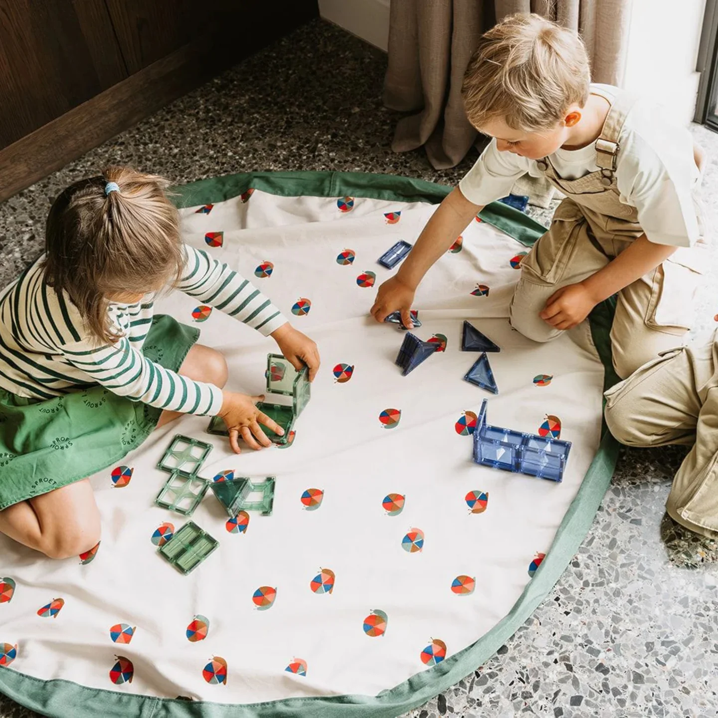 Φέρτε φίλους και συγγενείς για να ξεκουραστείτε και να παίξετε σε αυτό το μεγάλο κυκλικό χαλί, το οποίο, όταν τελειώσει το παιχνίδι, μπορεί χρησιμοποιηθεί ως τσάντα αποθήκευσης . Ο κομψός σχεδιασμός του είναι διπλής όψης και πλήρως αναστρέψιμος, και θα προσελκύσει αγόρια και κορίτσια κάθε ηλικίας.