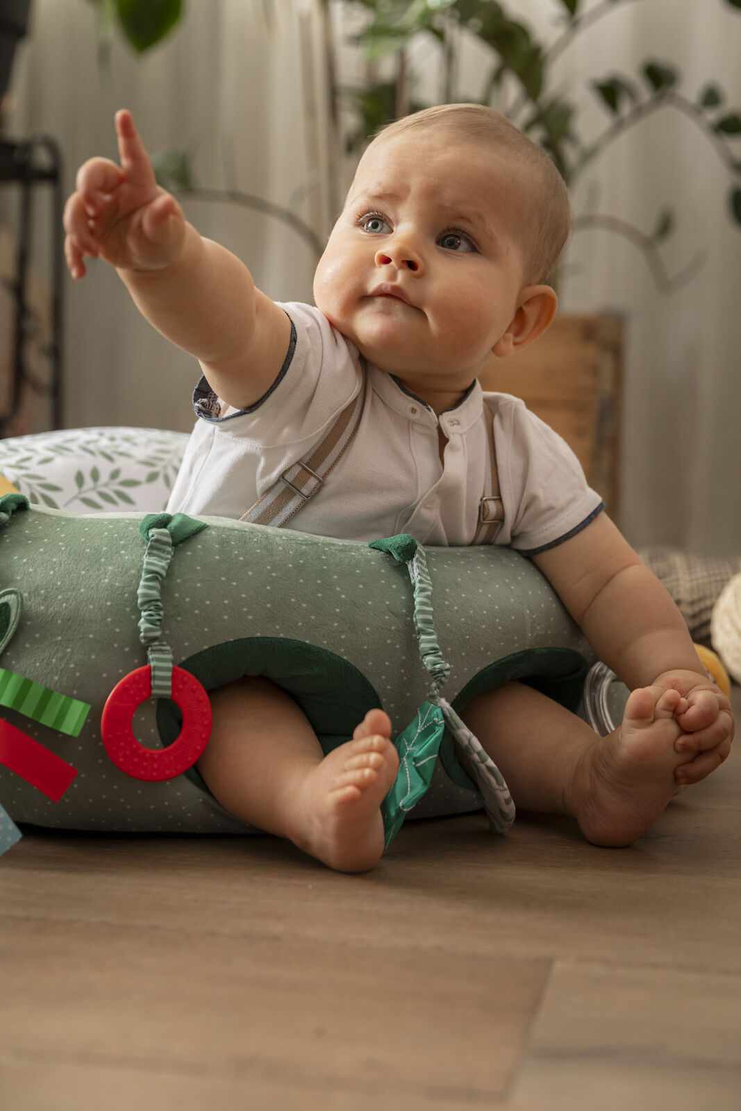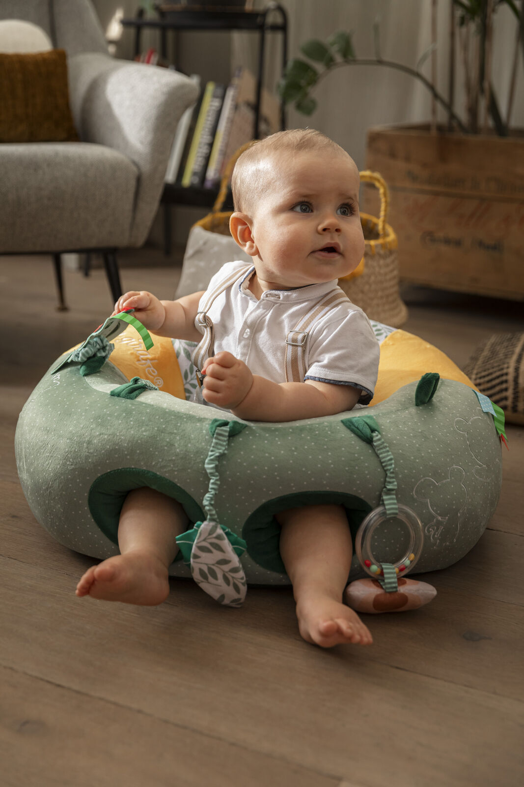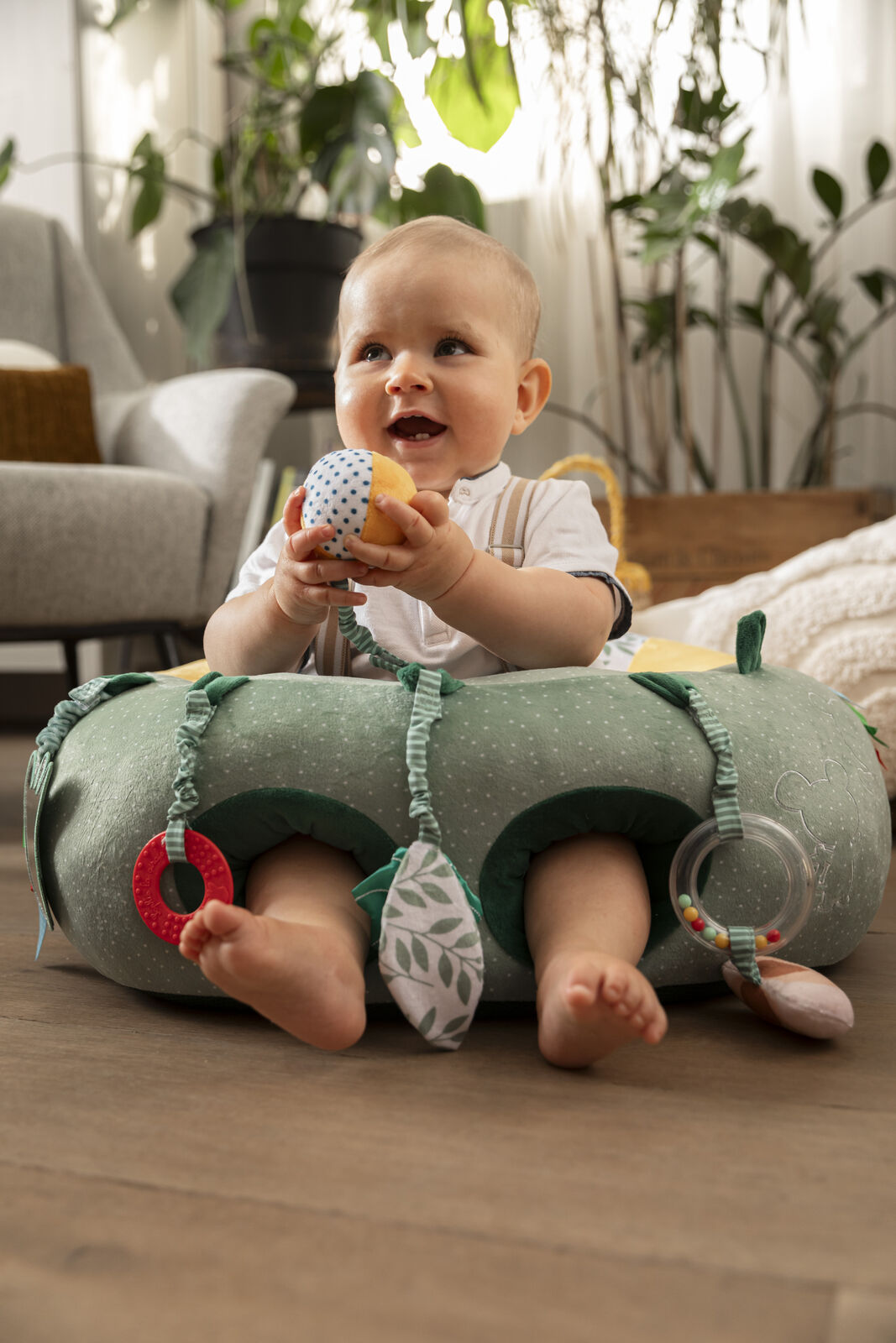 Είναι το μαξιλάρι παιχνιδιού που θα θέλει να κάθεται κάθε μωρό! Η κατασκευή του είναι πολύ στιβαρή ώστε να στηρίζεται με ασφάλεια το μωρό ή να κάνει κινήσεις μπρος πίσω χωρίς να φοβάστε ότι θα πέσει αριστερά-δεξιά. Έχει πολύ απαλή υφή, υπέροχα χρώματα και φιγούρες και αποσπώμενα παιχνιδάκια διασκέδασης και … ανακούφισης! Ο πάτος είναι αντι-ολισθητικός οπότε δεν υπάρχει καμία αγωνία αν γλιστράει. Το βραβευμένο μαξιλάρι είναι το πρώτο βρεφικό κάθισμα που συνδυάζει άνεση και αισθητηριακή διέγερση μαζί!