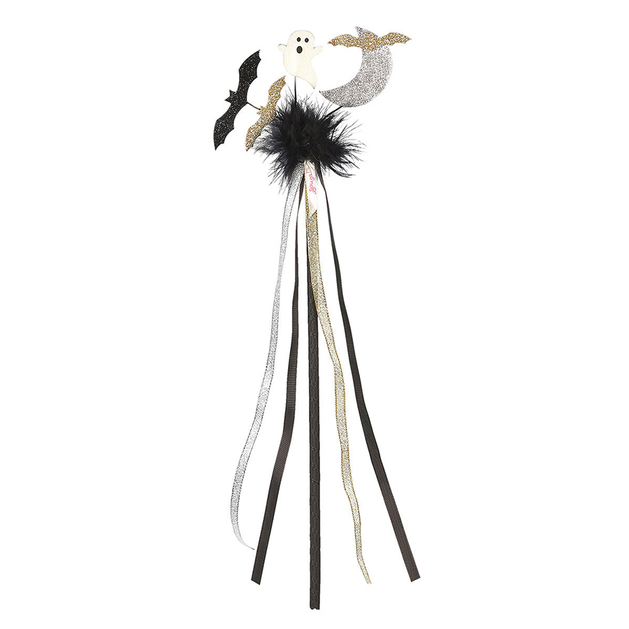 Ραβδί διακοσμημένο με μαύρες, χρυσές και ασημένες κορδέλες, μαύρα φτερά, φαντασματάκια και φανταχτερές νυχτερίδες. Μήκος ραβδιού: 36 εκ.